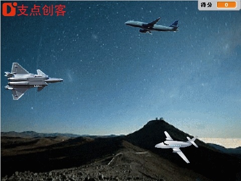编程过程涉及到事件、移动、广播、造型、变量、运算、声音、克隆、判断、重复、侦测等,游戏功能为:J20发射子弹击中敌机,则敌机爆炸并积一分,敌机溜走则减一分。点击上图可在线游戏-支持手机。