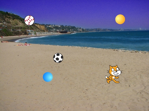 编程过程涉及到事件、移动、广播、造型、变量、运算、声音、判断、重复、侦测等,游戏功能为:小猫由鼠标控制,两个小球随机飞出,小猫要躲开小球,如果被小球碰到游戏结束。点击上图可在线游戏-支持手机。